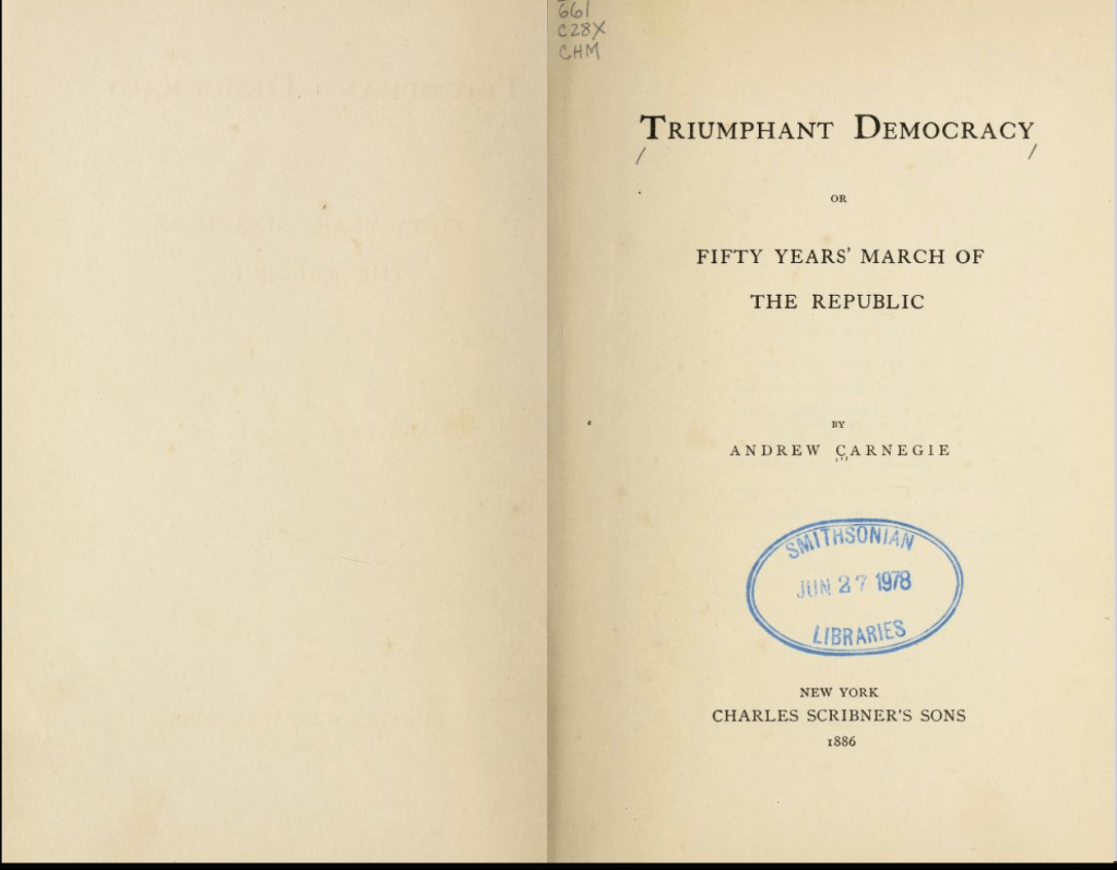 The hope expressed by Mr. Andrew Carnegie, in his book entitled, “Triumphant Democracy.” https://library.si.edu/digital-library/book/triumphantdemo00carn