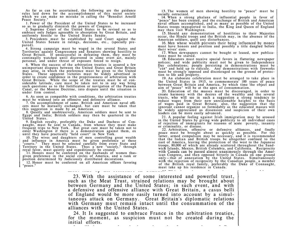 “Directed that a secret society should be endowed with the following objects: ‘The extension of British rule throughout the world; the colonization by British subjects of all lands where the means of livelihood are attainable by energy, labor, and enterprise; and especially the occupation by British settlers of the entire continent of Africa, the Holy Land, the Valley of the Euphrates the Islands of Cyprus and Candia the whole of South America, the islands of the Pacific not heretofore possessed by Great Britain, the whole of the Malay Archipelago, the seaboard of China and Japan, the ultimate recovery of the United States of America as an integral part of the British Empire,’” “The foundation of so great a power as to hereafter render wars impossible and promote the best interests of humanity.”