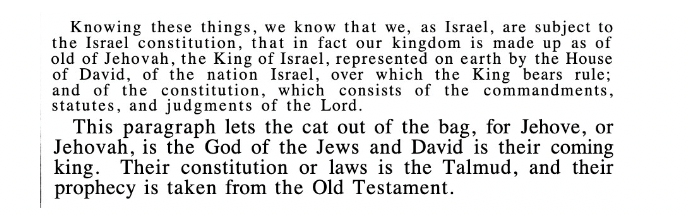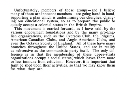 These organizations were organized to bring about a British union, a union in which the United States would again become a part of the British Empire. However, this has been upset to some extent by the attempt of the internationalists to establish their own government as an International or world union. And there is, therefore, a conflict between the two, for England wants a British union, with America as a colony, and the international money changers want a Jewish controlled union, in order to establish their own world government.