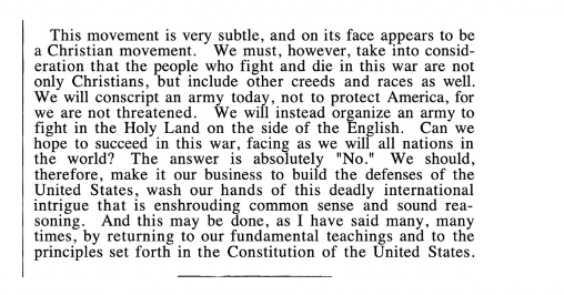 “Let us now be practical. The United States Army and the United States Navy, conscripts or no conscripts, are to crusade in a stupid war in Asia and Africa. Our young men are to give their lives – not in protection or defense of the United States, but for the sole purpose of establishing a kingdom in Arabia with Jerusalem as the capital, and with David as the king of the world.”