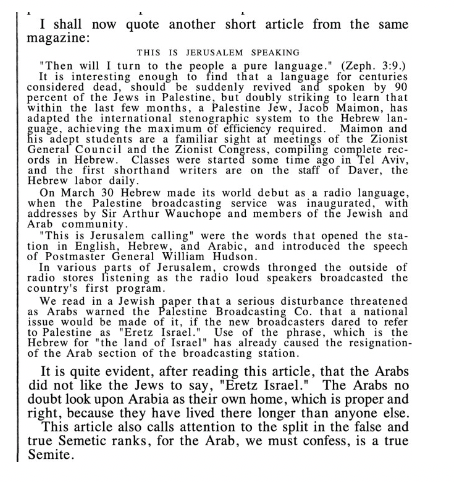 Such exodus might also prove inconvenient to our idle, wealthy, and charming ladies and their parents, when in their crusade to obtain a new or slightly used husband to hang on their family tree, they find it necessary to embark for Palestine to satisfy their family ambition. It is this and more that the Americans must fight to counteract the propaganda which is now disseminated throughout the country and in our daily press, in order to save America for the Americans.