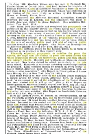 This statement is clear, and the organizations which Mr. Carnegie endowed have spent millions in order to bring this about. This thing has been made possible by scholarships, exchange professors, subsidies of churches, subsidies of educational institutions; all of them working for the purpose of eliminating Americanism as was taught once in our schools and to gradually exchange this for an English version of our history.