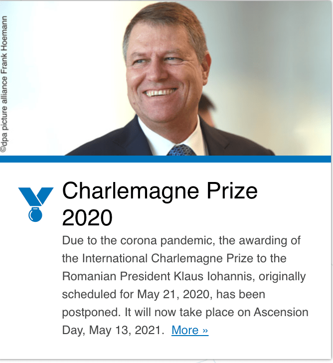 - Klaus Iohannis 2020. Due to the corona pandemic, the awarding of the International Charlemagne Prize to the Romanian President Klaus Iohannis, originally scheduled for May 21, 2020, has been postponed. It will now take place on Ascension Day, May 13, 2021 https://www.karlspreis.de/en/laureates