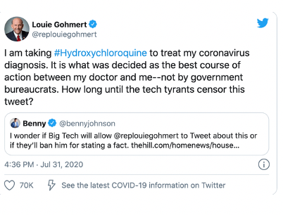 “I am taking ≠Hydroxychloroquine to treat my coronavirus diagnosis,” Gohmert wrote in a tweet. “It is what was decided as the best course of action between my doctor and me—not by government bureaucrats. How long until the tech tyrants censor this tweet?”