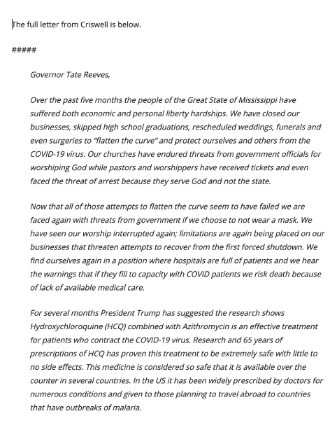 “It is time the people of Mississippi take control of their health and well-being during this pandemic,” Criswell writes in an email. “Doctors have been prohibited from prescribing a well-documented and safe treatment to combat the COVID-19 virus and pharmacist have been instructed to deny any prescription of Hydroxychloroquine.”