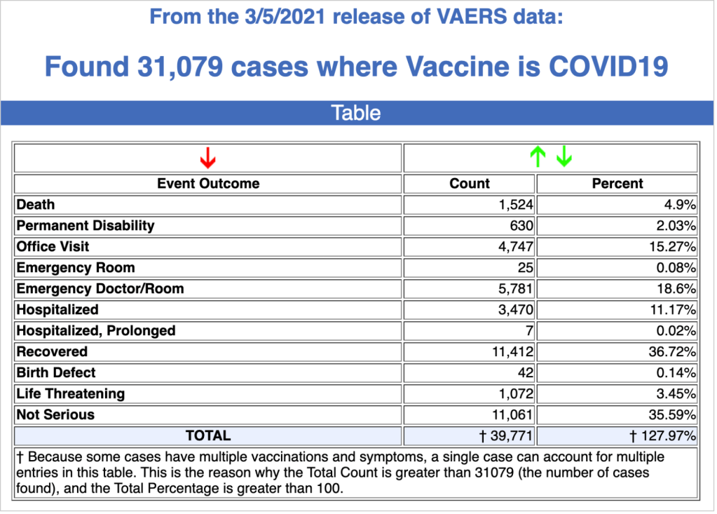 - Between Dec. 14, 2020, and Mar. 5, 2021, 31,079 reports of adverse events were submitted to VAERS, including 1,524 deaths, 5,507 serious injuries and 390 reports of Bell’s Palsy. https://childrenshealthdefense.org/defender/vaers-reports-death-up/