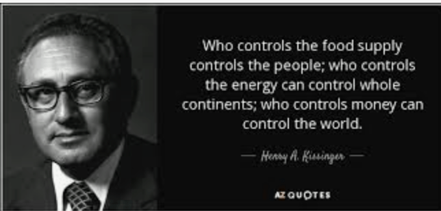 Control the food, control the people. Control the energy, control whole continents, and Control the money, control the world. – Henry Kissinger